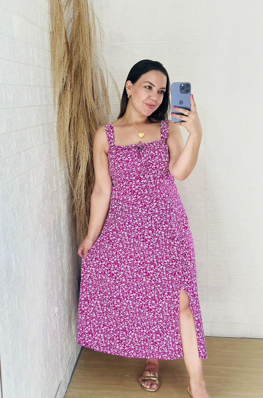 O modelo apresenta estampa floral miúda, de visual delicado e atemporal. O comprimento midi proporciona elegância e versatilidade, enquanto a fenda frontal facilita a mobilidade e valoriza o design da peça.