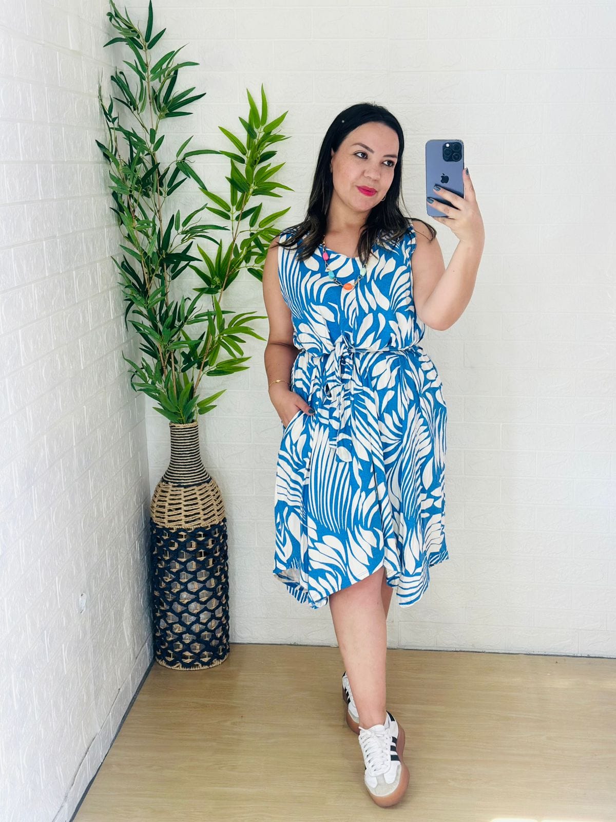é perfeito para quem busca praticidade sem abrir mão do estilo. Com estampa moderna em tons de azul e branco, ele transmite leveza e frescor, ideal para compor looks versáteis e confortáveis.